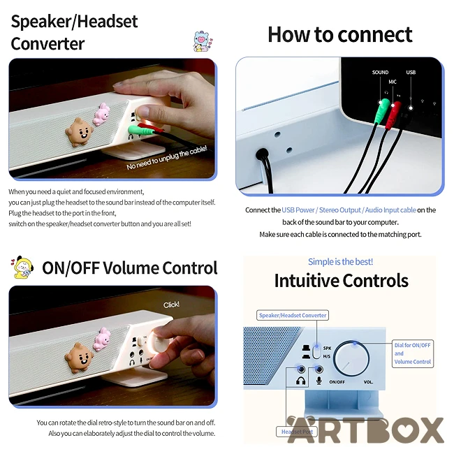 Add a touch of cuteness to your home with this adorable BT21 Baby sound bar! It’s cutely designed with a sweet My Little Buddy series removable character magnet decorations and is powered via the USB cable included. The speaker plugs in with 40mm audio jacks provided and has a retro volume control dial. It has a 35mm headphones port, so you can switch between speaker mode and headphones with a push of a button.