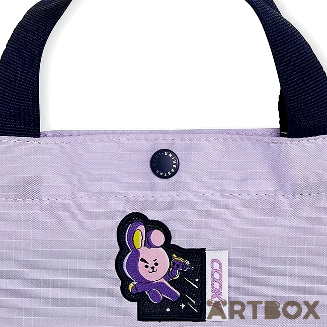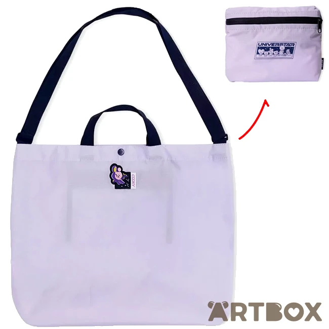 This folding BT21 shopping bag features a fun and quirky Space Wappen series design applique on the front and is as cute as it is practical! It folds up into a little pouch with character print on the front, but unfolds into a roomy tote-style shopper with the pouch turning into a handy inner pocket. The bag is made out of strong RipStop fabric with short handles and a long shoulder strap, perfect for everyday use.