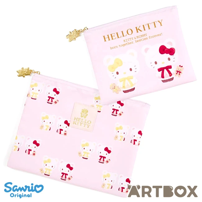 This cute flat pouch set is part of Hello Kitty & Mimmy Bear Cape series and has a multitude of uses – e.g. as a pencil case, makeup bag or to keep small items safe. The pouches are made out of soft fabric cutely printed with matching designs and feature adorable bear shaped zipper pulls.