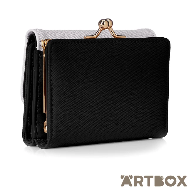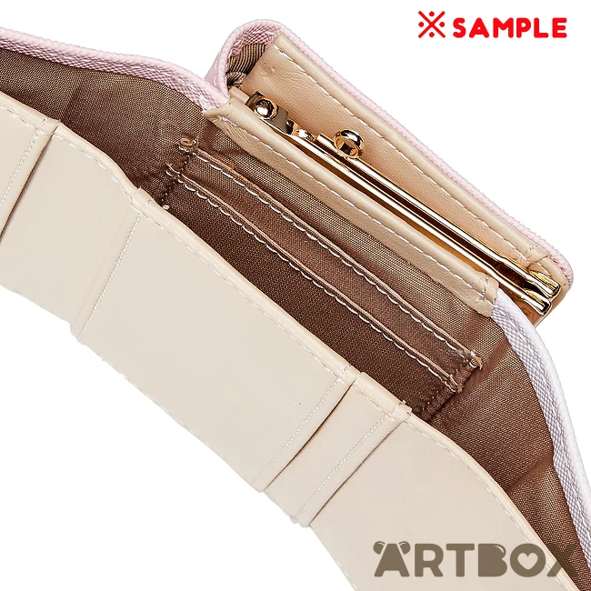 This pretty and elegant small wallet is a must have for any Sanrio fan! It’s made out of textured faux leather style fabric with a pretty colour block detail and an enamel character decoration on the front. The purse closes with a popper and opens up to reveal pockets for notes and cards, and a kiss lock coin pocket.